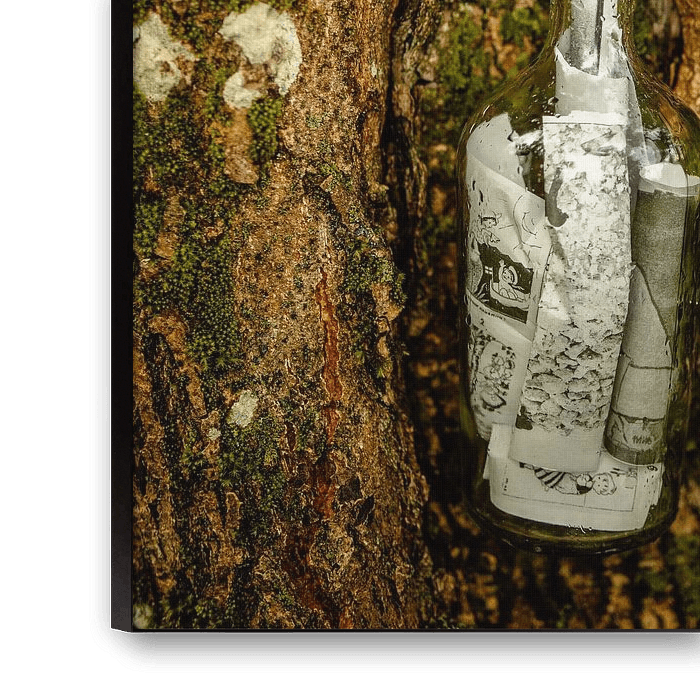 Eine Glasflasche mit Holzverschluss und gerollten Papieren hängt an rauer, moosiger Rinde. Erdige Farben und starke Oberflächenstruktur verleihen dem Motiv eine nostalgische, erzählerische Stimmung. Ein stimmiges Wandbild für Naturfreunde, Cafés, Flure und gemütliche Wohnräume im rustikalen Stil.