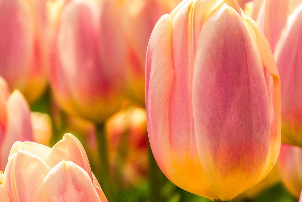 Een veld vol met fleurige tulpen stonden te stralen in de zon. De zon laat het mooiste van deze bloem zien.