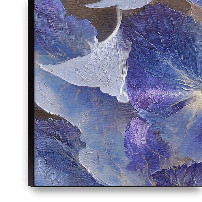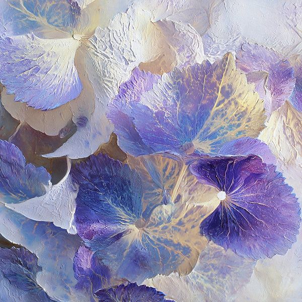 reich geschichtete Komposition von Blütenblättern in Lila- (Farbe), Blau- und Creme-Tönen. Die Details der Textur sind fast greifbar: Jedes Blütenblatt scheint aus Pinselstrichen zu bestehen, die die Maserungsstrukturen und Falten betonen. Die Komposition strahlt eine gewisse Verträumtheit aus, die zum Teil auf den weichen Farbverlauf…
