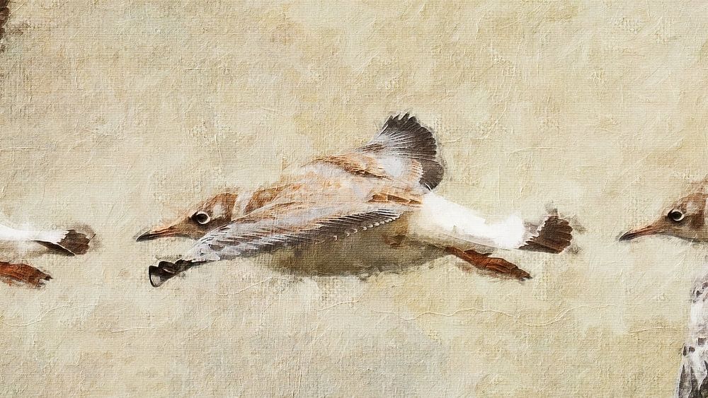 Digitales Gemälde, das die vollständige Flugbewegung einer jungen Lachmöwe zeigt. Die Abfolge der Bewegungen lässt es wie 3 verschiedene Lachmöwen aussehen, aber in Wirklichkeit ist es nur eine.