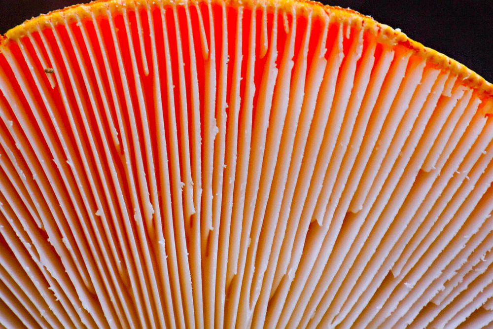 Ein Fliegenpilz, der von unten fotografiert wurde, um die Konturen der Unterseite schön darzustellen. Die schönen klaren Linien des Fliegenpilzes geben einen schönen Kontrast zu der runden Form.