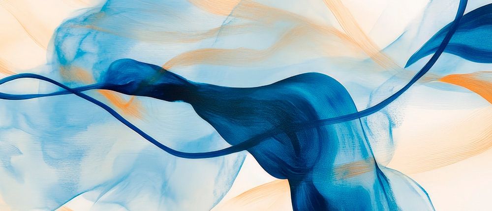 Sanfte Wellen in harmonischem Blau und warmem Orange tanzen über ein sanftes, helles Hintergrundmuster. Diese lebendigen Farbverläufe verleihen jedem Raum eine entspannende Atmosphäre. Ideal für das Wohnzimmer oder die Küche, bringt dieses Kunstwerk sowohl Freude als auch eine ruhige Eleganz in den Alltag Ihrer Umgebung.