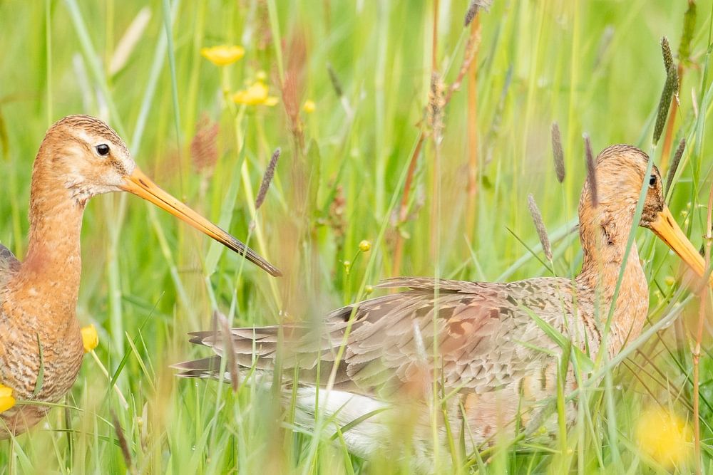 Flirtende Uferschnepfen im zeitigen Frühjahr, im krautreichen Gras.