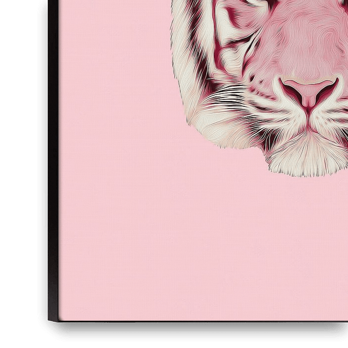 Dieses Kunstwerk zeigt ein auffallendes und surreales Porträt eines rosafarbenen Tigers, der zart mit blühenden Blumen und einem sanft ruhenden Schmetterling geschmückt ist. Vor einem pastellrosa Hintergrund vereint die Komposition Stärke und Zärtlichkeit auf eine visuell fesselnde Weise. Der intensive und doch ruhige Blick des Tigers…