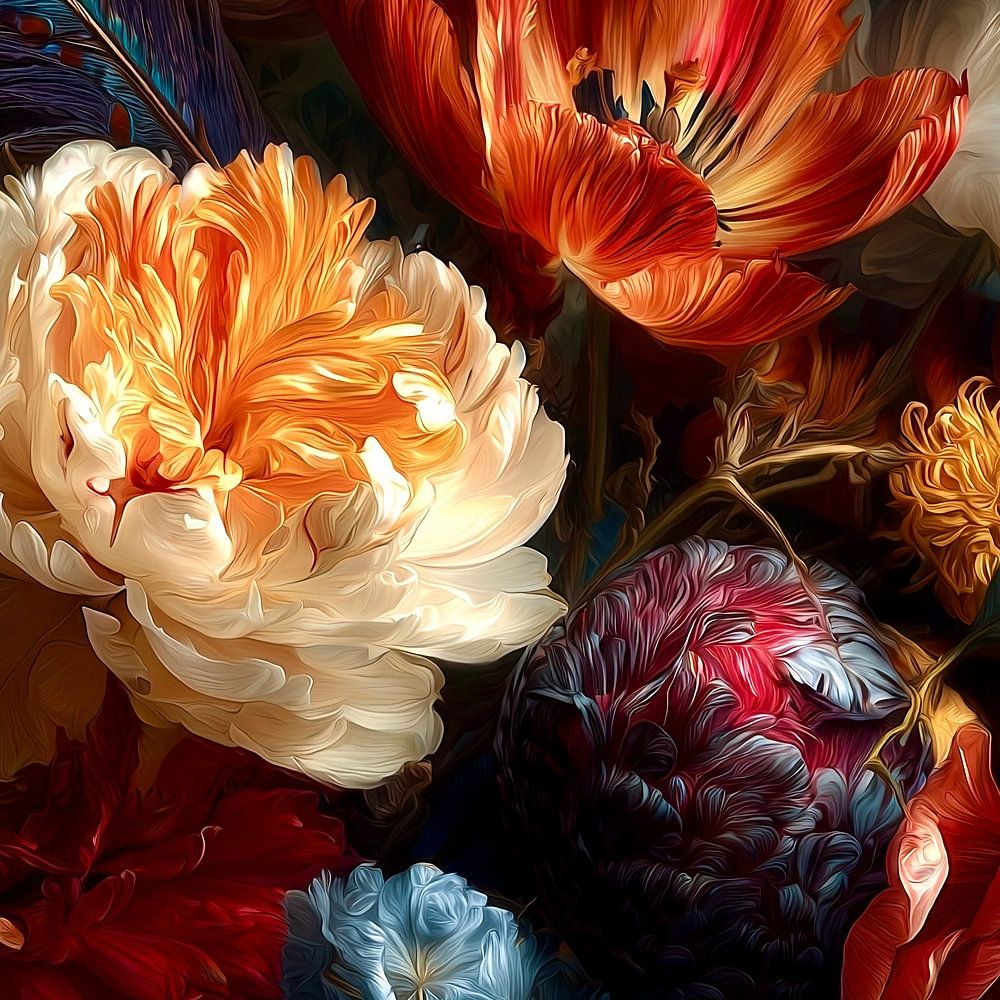 Floral Symphony ist eine visuelle Ode an Überfluss, Farbe und Raffinesse. In diesem barocken Blumenstillleben vereinen sich Pfingstrosen, Tulpen, Rosen und Chrysanthemen zu einer üppigen Komposition voller Leben und Textur. Zwischen den Blüten schwebt eine anmutige Pfauenfeder mit schillernden Blau- und Orangetönen - eine unerwartete Ergänzung, die dem Ganzen eine mystische Schichtung verleiht.