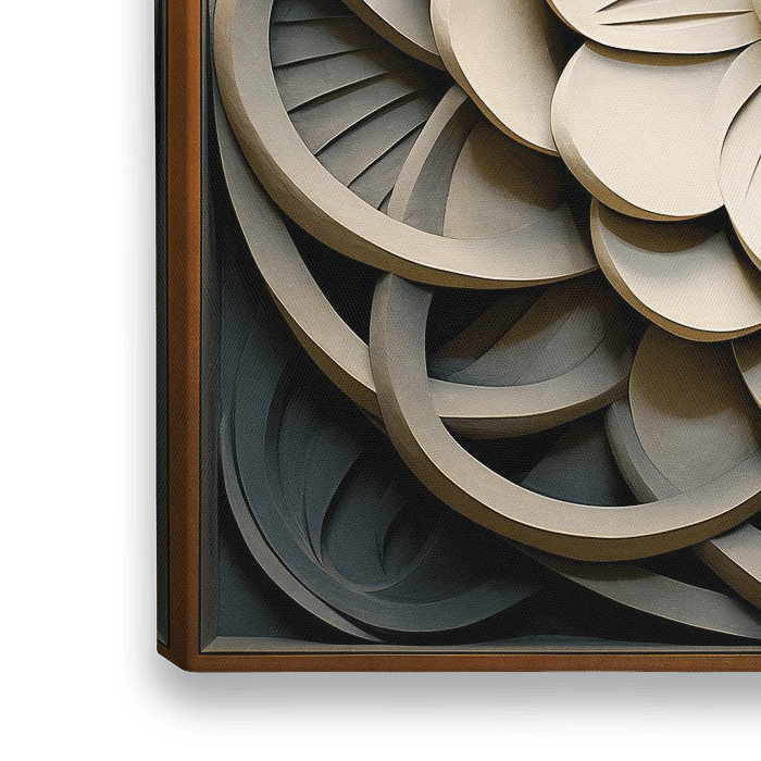 Abstrakte Mandala-Blume als Holzschnitzerei mit grober Textur und dreidimensionalem Effekt.