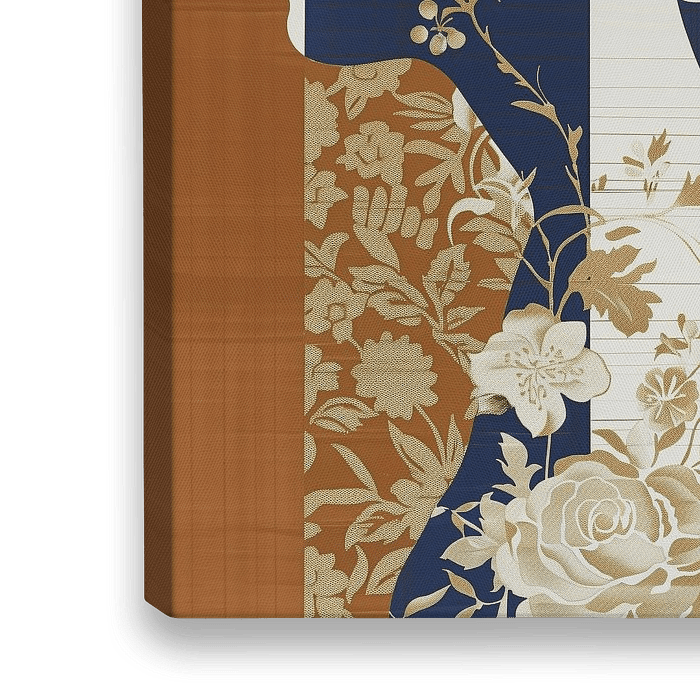 Seitenansicht eines stilisierten Frauenporträts, das in zwei Hälften mit kontrastierenden Farben und Mustern unterteilt ist. Die linke Hälfte der Silhouette ist mit dunkelblauen und detaillierten floralen Mustern in Beige und Weiß gefüllt, während die rechte Hälfte hauptsächlich weiß mit subtilen floralen Motiven ist. Der Hintergrund…