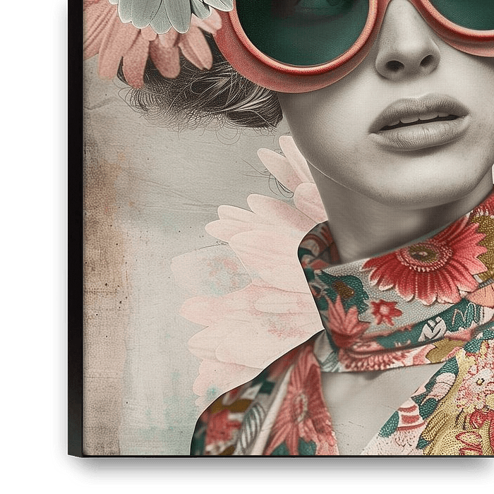 Surreales Porträt einer Frau, die eine auffallend elegante Brille mit großen, runden, dunkelgrünen Gläsern und einem dicken, roten Rand trägt. Ihre Frisur, elegant und voluminös, ist mit mehreren Blumen in leuchtenden Rot-, Rosa-, Türkis- und Grautönen geschmückt. Diese Blumen sind kunstvoll um ihren Kopf verstreut, was einen…