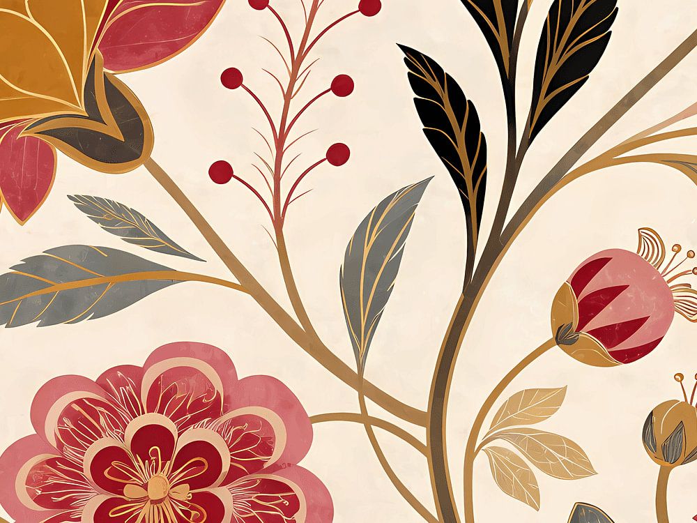 Ein lebhaftes und kompliziertes Blumenmotiv entfaltet sich auf einem subtil strukturierten, hellbeigen Hintergrund. Kühne, stilisierte Blüten in tiefen Rot-, warmen Gold- und zarten Rosatönen verflechten sich mit elegant geschwungenen Stängeln und einer Vielzahl von Blättern in Schwarz-, Grau- und gedämpften Goldtönen. Zarte Beeren und kleinere florale Elemente verleihen diesem nahtlosen Muster Tiefe und visuelles Interesse und erwecken ein Gefühl von reicher botanischer Kunstfertigkeit.