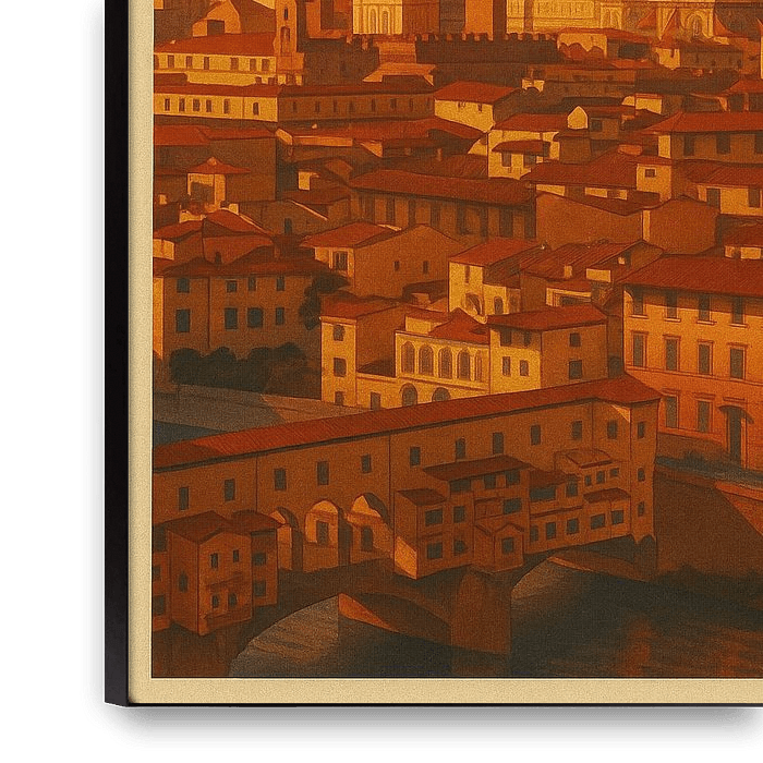 Dieses Kunstwerk zeigt die Renaissance-Schönheit von Florenz, Italien, mit dem prächtigen Dom, der das historische Stadtbild überragt. Das im Stil eines alten Art-Déco-Reiseplakats gestaltete Werk fängt goldene Lichtstrahlen ein, die die ikonische rote Kuppel der Kathedrale und die umliegende Architektur beleuchten. Warme Terrakotta-…