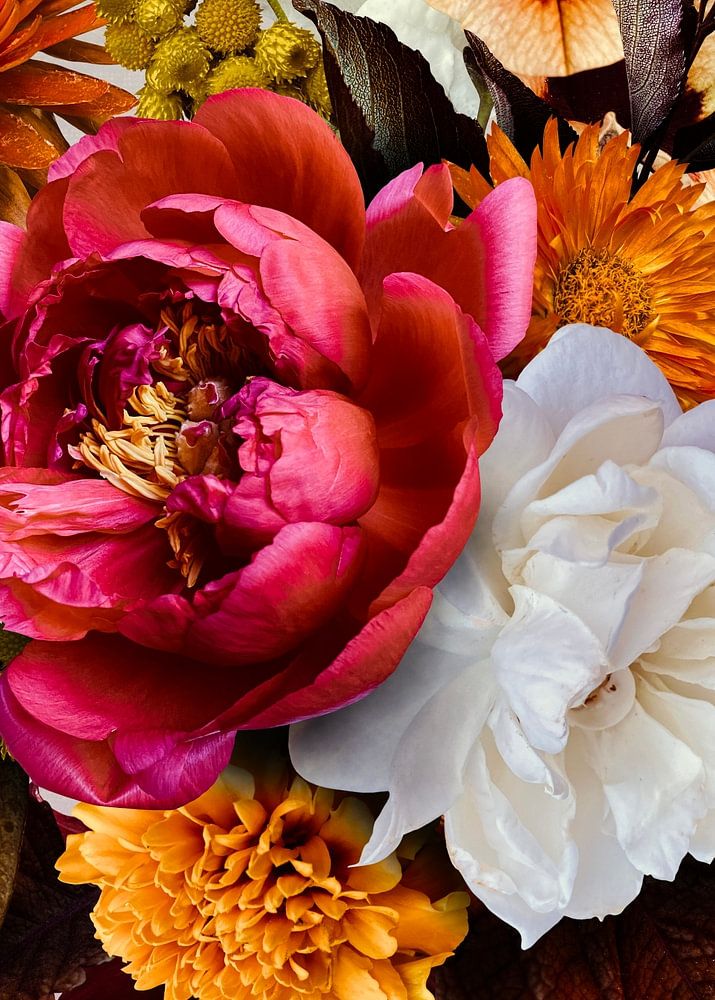 Bunter Strauß in Orange-, Rosa- und Weiß-Tönen. Sehr schön im Großformat oder als Tapete an der Wand.