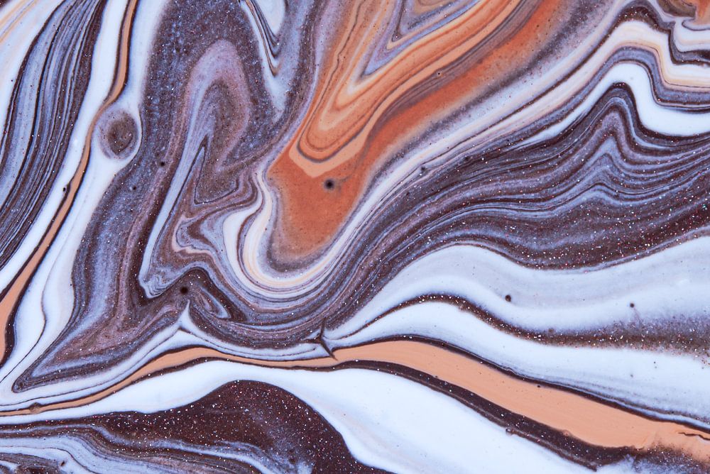 "Flüssige Farben: Linien in Braun-, Orange- und Erdtönen" ist ein abstraktes Werk aus verschiedenen Flüssigkeiten (darunter Farbe mit kleinen Glitzern und "Vintage"-Farbe), die über die Leinwand "fließen". (abstrakt) Ein Foto wurde von einem kleinen Teil des Gemäldes gemacht und bearbeitet. Die am häufigsten verwendeten Farben in diesem Werk sind Braun, Orange, Weiß und Schwarz, also Retrofarben.