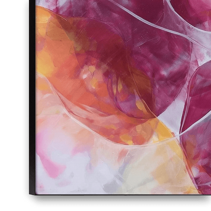 Wirbel aus transparenten und sich überlagernden Formen, die an organische Blattformen oder Blütenblätter erinnern, die in Bewegung geraten sind. Die Komposition besteht aus fließenden Linien und runden Strukturen, die sich in verschiedene Richtungen entfalten. Die Farbschichten sind satt und intensiv: Fuchsia-Rosa, Korallenrot, warmes…