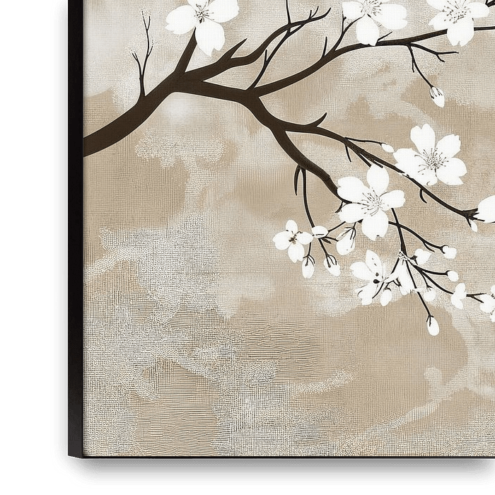 Whispering Blossoms - Dieses florale Gemälde zeigt ein vereinfachtes Bild eines Zweigs mit blühenden Blüten, das in einem monochromen Farbschema gehalten ist. Das Hauptelement des Gemäldes ist der dunkelbraune Zweig, der sich diagonal von links unten nach rechts oben über die Leinwand zieht. An diesem Zweig befinden sich mehrere Äste,…