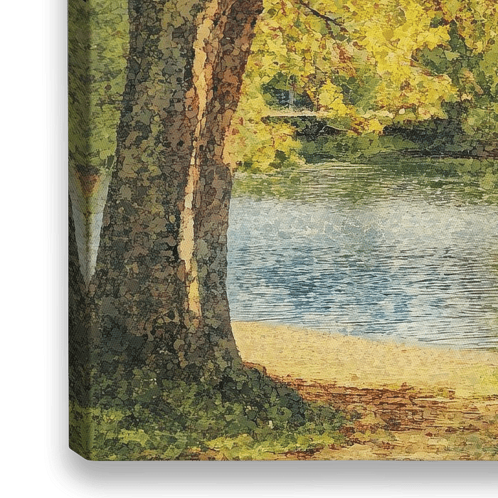Whispering Lakeside - Dieses Landschaftsgemälde zeigt einen friedlichen See, der von mehreren Bäumen umgeben ist. Das Licht spielt durch das Laub und erzeugt Spiegelungen auf der Wasseroberfläche.