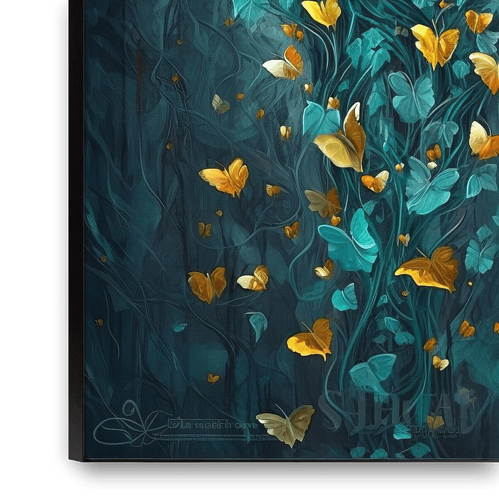 Dieses Bild zeigt eine magische Szene aus der Natur, in der ein eleganter türkisfarbener Schmetterling in den Mittelpunkt der Aufmerksamkeit schwebt. Hinter ihm flattern anmutige Gefährten in einem zarten Tanz, während Blütenblätter wie luftiges Konfetti aufgewirbelt werden und die Szene verzaubern.