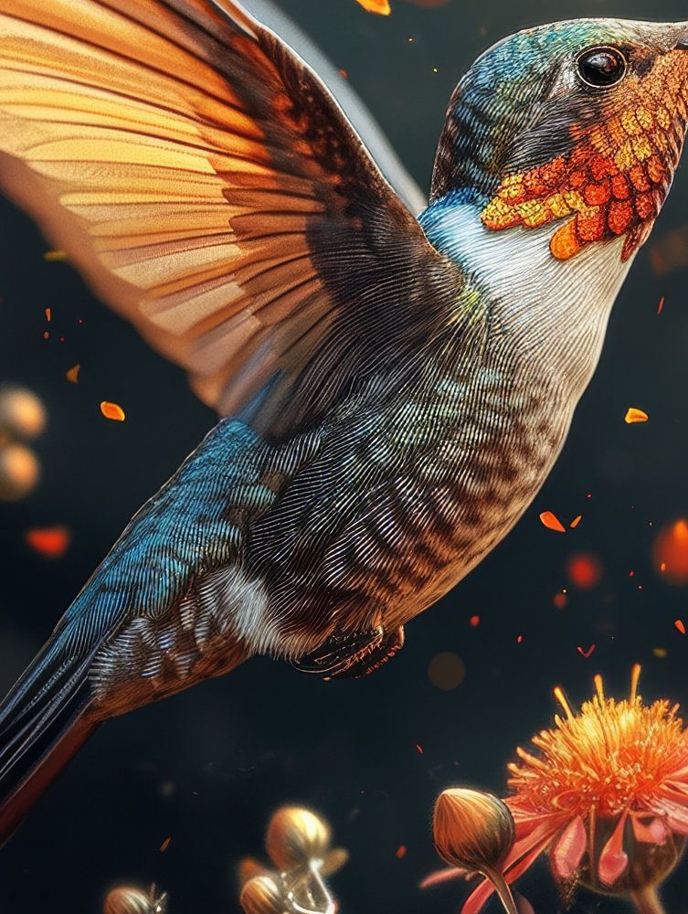 Entdecken Sie den Zauber von "Fluorescent Flight", einem atemberaubenden Kunstwerk, das die lebendige Schönheit eines Kolibris in vollem Flug zeigt. Umgeben von einer Blüte aus Orangenblüten leuchtet dieser Vogel in einem Prisma aus Farben vor einem weichen, dunklen Hintergrund. Die glitzernden Flügel und die zarten floralen Details schaffen eine bezaubernde Atmosphäre, die den Betrachter in eine Welt voller Wunder und natürlicher Anmut entführt. Dieses Werk ist perfekt für alle, die sich von der Farbenpracht der Natur und der künstlerischen Darstellung von Tieren in ihrem Lebensraum inspirieren lassen möchten.