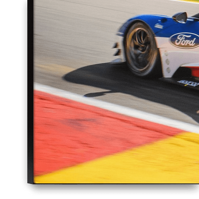 Ford Chip Ganassi Racing Ford GT-Rennwagen, der während der sechs Stunden Spa der FIA World Endurance Championship 2016 auf der Rennstrecke Spa-Francorchamps durch Eau Rouge fährt.