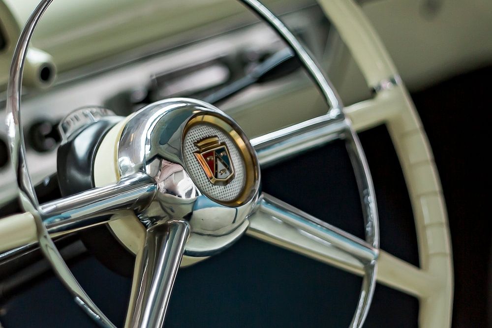 Wunderschönes Interieur des Ford Crestline Skyliner, ein von Ford gebautes Auto mit einem Hardtop-Karosseriestil mit 2 Türen und einer integrierten Acrylglasscheibe über dem vorderen Sitzbereich. Er war Teil der amerikanischen Ford Crestline-Reihe von 1954 und zeichnete sich durch seine grün getönte Verkleidung aus. 13.144 Stück wurden in einem Produktionsjahr verkauft, mehr als in den zwei Jahren, in denen der Crown Victoria Skyliner produziert werden sollte. Mercury's Monterey Sun Valley war ähnlich. Im Jahr 1954 wurden 9.761 davon gebaut.