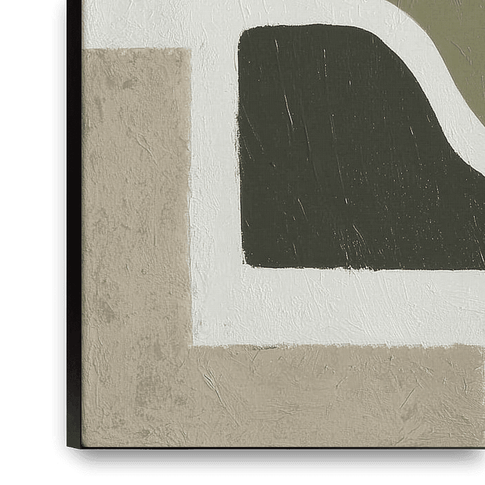 harmonische Komposition aus organischen und geometrischen Formen, gemalt in einer gedämpften Palette von Erdtönen. Die zentrale Form, die an eine stilisierte Pflanze oder eine Korallenstruktur erinnert, ist in einem sanften Olivgrünton gehalten. Sie schwebt gleichsam über einer tiefschwarzen, abgerundeten Grundform, die ein Gefühl von…