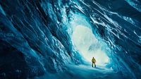 Das Bild zeigt einen Forscher in leuchtend gelber Kleidung, der eine beeindruckende Eishöhle erkundet. Die tiefblauen Eiswände und das einfallende Licht schaffen eine atemberaubende, geheimnisvolle Atmosphäre.