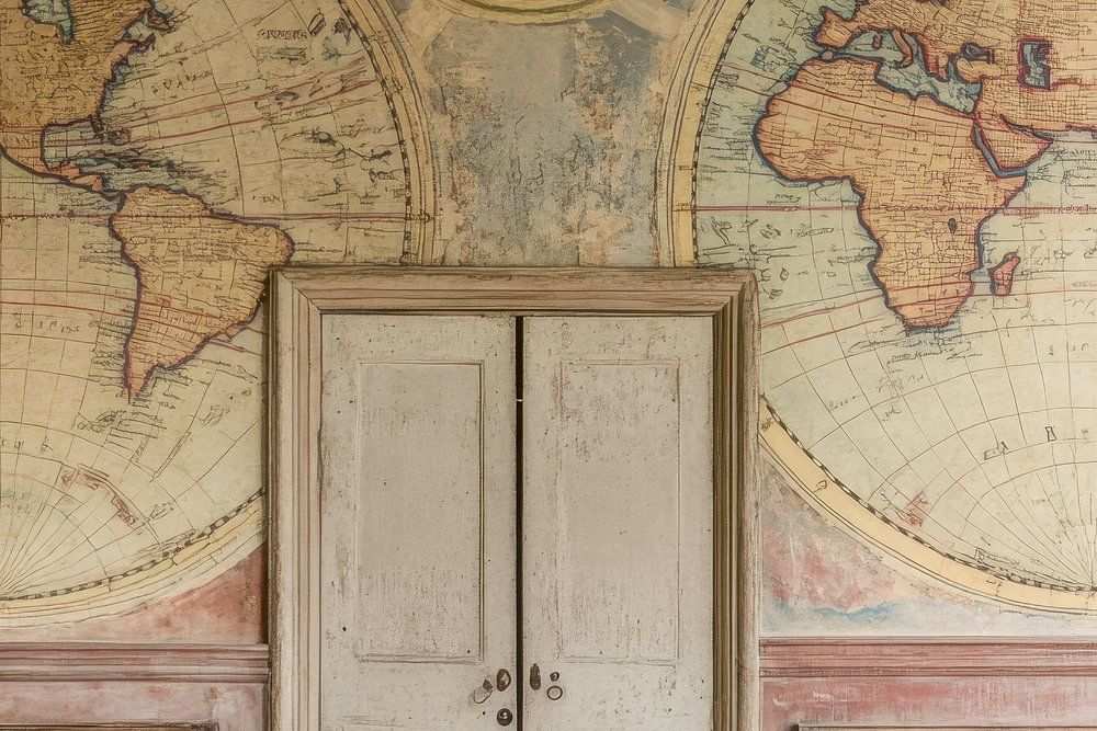 Bild einer verlassenen Schule. Alte Wand mit zwei großen Weltkarten im klassischen Stil. Die Karten sind kreisförmig angeordnet, mit einer Tür in der Mitte und zwei Holzbänken auf beiden Seiten der Tür. Die Wand und die Tür haben ein verwittertes, antikes Aussehen, das den historischen Charakter des Raumes noch verstärkt. Die Farben, die auffallen, sind hauptsächlich Erdtöne wie Beige, Braun und Hellgrün, mit Akzenten von verblichenem Blau und Rot auf den Karten.