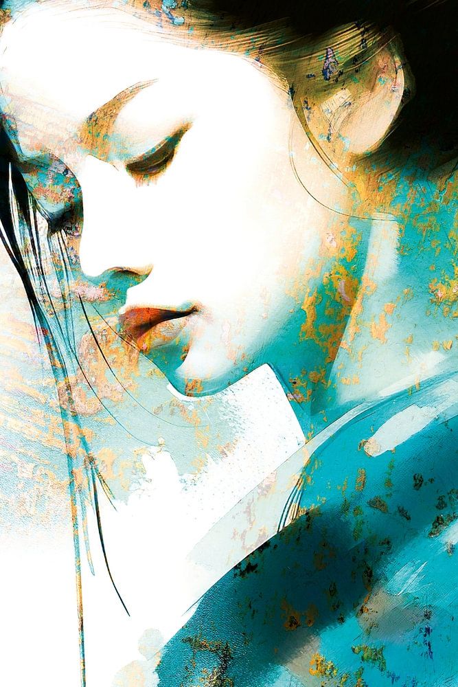 Porträt in Mischtechnik im Stil der traditionellen Geisha. Eine Geisha ist traditionell eine japanische Muse für Künstler. Mit dem Begriff Geisha wird im Allgemeinen eine Hofdame bezeichnet, die in der typischen, streng stilisierten Kleidung gekleidet ist und den Abend einer Gesellschaft mit klassischer japanischer Musik, Gesang und Tanz angenehm auflockert. Wörtlich bedeutet Geisha "Kunstperson".