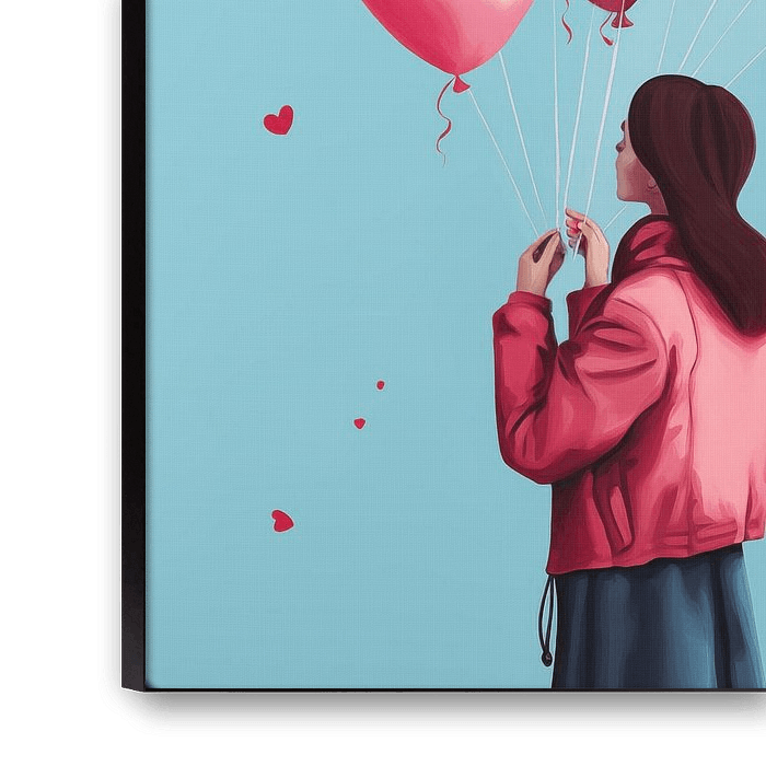 Eine Illustration einer Frau, die ein Bündel herzförmiger Luftballons hält.