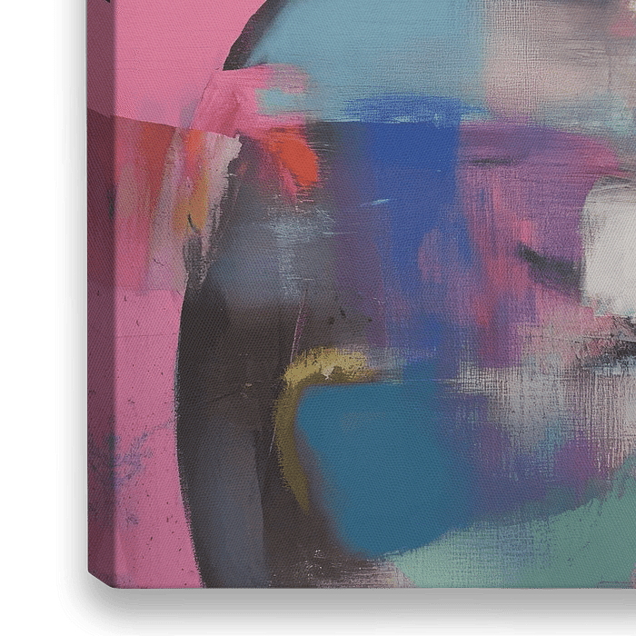 Dieses abstrakte Kunstwerk strahlt eine lebendige Energie aus, mit einer spielerischen Mischung aus Farben und Formen. Die Figur wirkt menschlich, ist aber stark stilisiert und besteht aus geometrischen Formen und Farbflächen. Der Hintergrund besteht aus leuchtenden Rosa- und Violetttönen, während die Figur selbst eine Kombination aus…