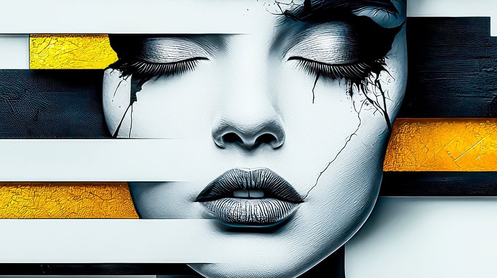 Die horizontalen Balken, in Schwarz, Weiß und Gold gehalten, verleihen dem Bild eine rhythmische Struktur. Sie erinnern an digitale Verzerrungen oder an eine sich auflösende Erinnerung. Goldene Elemente, von rauer Textur durchzogen, wirken wie Fragmente einer verlorenen Wahrheit – eine Erinnerung an das, was einst unversehrt war. Das Schwarz hingegen verstärkt den Kontrast und gibt dem Bild eine dramatische Tiefe.