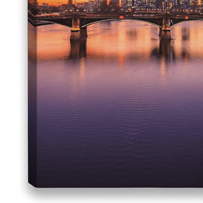Bestelle das Foto Frankfurt am Main Skyline Blick am Abend von Fotos by Jan Wehnert als Reproduktion auf Leinwand, Alu-Dibond, als Poster, Fototapete oder Acrylglasbild.