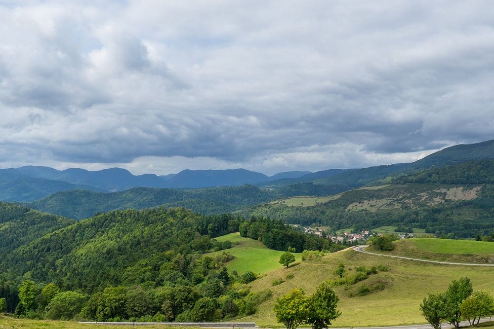 Frankreich - Kurvenreiche Straße durch die grüne Landschaft der Vogesen im Herbst
