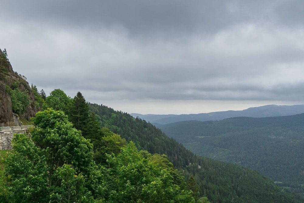 Frankreich - Rechts abbiegende Straße auf dem Gipfel eines Berges mit einem bewaldeten Tal daneben