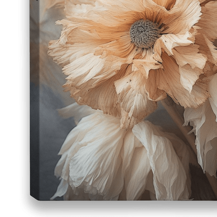 Trockenblumen, Mohn, mit ausgefransten Rändern in Creme- und Beigetönen.