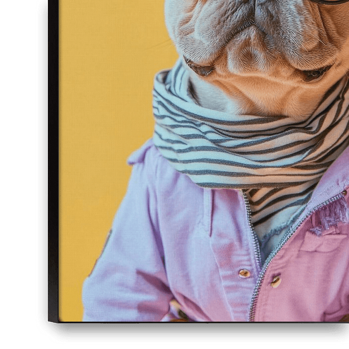 Mit strahlenden, rundlichen Augen und einem charmanten Ausdruck strahlt die Französische Bulldogge besondere Lebensfreude aus. Ihre unverwechselbaren, großen Ohren stehen stolz vom Kopf ab, während der modische Schal und die schicke Sonnenbrille ihr einen Hauch von Stil und Humor verleihen. Auf einem warmen gelben Hintergrund wirkt sie…