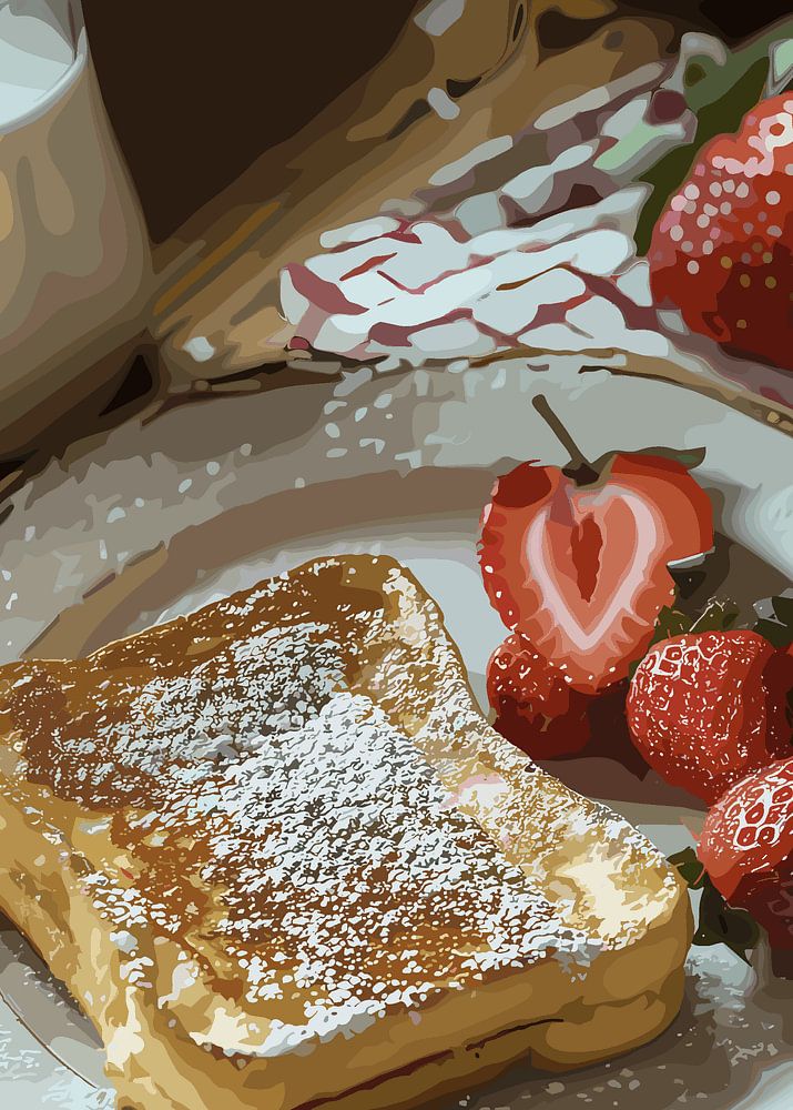 Ein stilvolles Stillleben mit einem liebevoll angerichteten Frühstück. Im Mittelpunkt steht ein goldbrauner französischer Toast, bestäubt mit feinem Puderzucker, auf einem eleganten Teller. Daneben liegen saftige Erdbeeren, einige davon halbiert, um ihr frisches Inneres zu zeigen. Im Hintergrund steht eine kleine Kanne mit Milch auf einem rustikalen Holztisch. Eine rot-weiß karierte Serviette verleiht dem Arrangement eine gemütliche, ländliche Atmosphäre. Sanftes Licht aus einem Fenster hebt die warmen Farben hervor.