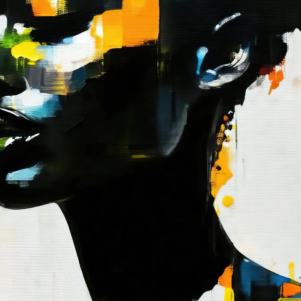 Frau abstrakt | Abstraktes Porträt in Schwarz-Gelb - Dies ist ein abstraktes Frauenbild, bei dem ausdrucksstarke Farbspritzer und kontrastierende dunkle Töne das Gesicht einer Frau in einem modernen künstlerischen Stil hervorheben.