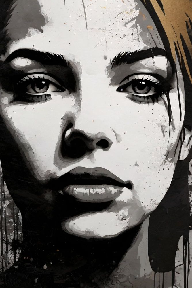 Entdecken Sie kühne Ausdruckskraft und moderne Resonanz mit diesem Kunstwerk, das eine Explosion der Gefühle verkörpert. Das Gesicht einer Frau, das in einer kräftigen Palette von Schwarz-, Weiß- und Grautönen mit goldenen Akzenten dargestellt ist, ist ein Blickfang in jedem Raum. Die dynamischen Pinselstriche und Farbspritzer vermitteln einen tiefen Sinn für Bewegung und ein abstraktes Gefühl, das die Fantasie anregt. Die goldenen Farbtöne fangen das Licht ein und fügen ein Element von Luxus und Tiefe hinzu, während die Künstlerin mit ihrem Geschick für Kontraste und Formen eine Geschichte erzählt, die ebenso zeitlos wie aktuell ist. Dieses Kunstwerk wird für Gesprächsstoff sorgen und Ihrem Wohnzimmer, Schlafzimmer oder Büro ein stilvolles, zeitgenössisches Flair verleihen.