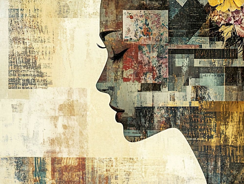 Woman Flowers | Woman Flowers - Dieses Frauenbild zeigt die Silhouette einer Frau mit Blumen im Haar in Seitenansicht, ausgeführt als moderne Abstraktion im Collage-Stil in gedämpftem Beige und Gold mit strukturierten Flächen und ocker- und türkisfarbenen Akzenten; Frauenbild, Frauenbild.