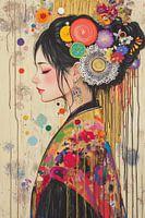 Frau Blumen | Fröhliche Frau mit Blumen - Dieses farbenfrohe Frauenporträt zeigt eine junge Frau im Seitenprofil, geschmückt mit einer bunten, blumigen Frisur und Ohrringen, vor einem Hintergrund aus abstrakten Farbspritzern.