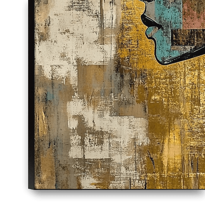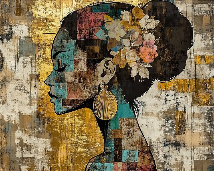 Frau Ohrring | Frau Gold – Dies ist ein Frauenbild in Seitenansicht einer Frau mit großem goldenen Ohrring und Blumen im Dutt, ausgeführt als modernes abstraktes Frauenbild mit blockartigen Farbflächen und einer zurückhaltenden Palette aus Erdtönen und Gold.