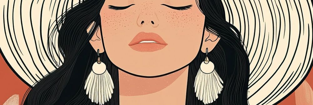 Woman Earrings | Relaxed Woman in Floral Background - Dieses Frauenbild zeigt eine Frau mit einem großen Hut und auffälligen Ohrringen, umgeben von weichen Blättern, die eine beruhigende und entspannende Atmosphäre hervorrufen.