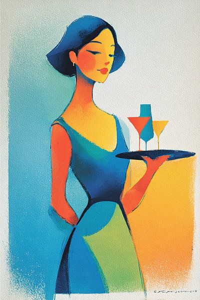 Woman Tray | Cocktail Woman - Dieses Gemälde zeigt eine Frau mit einem Tablett voller bunter Cocktails, gekleidet in ein elegantes blaues Kleid, das einen Hauch von Fröhlichkeit und Verspieltheit ausstrahlt, mit einem modernen, abstrakten Stil und hellen Farben.