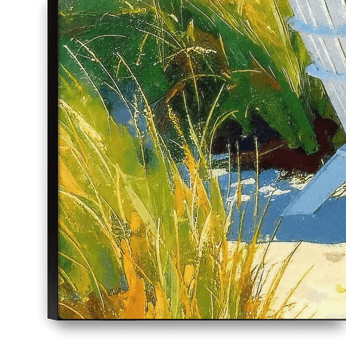 Dieses Gemälde entfaltet eine stille, kontemplative Szene von großer poetischer Kraft. In leicht pastosem Farbauftrag erscheint eine Frau, links im Bild positioniert, in einem weißen Strandstuhl, der auf einer sanften Erhebung im Sand ruht. Umgeben von dichtem, vom Wind bewegtem Dünengras wirkt ihr Platz zugleich geschützt und offen zur…