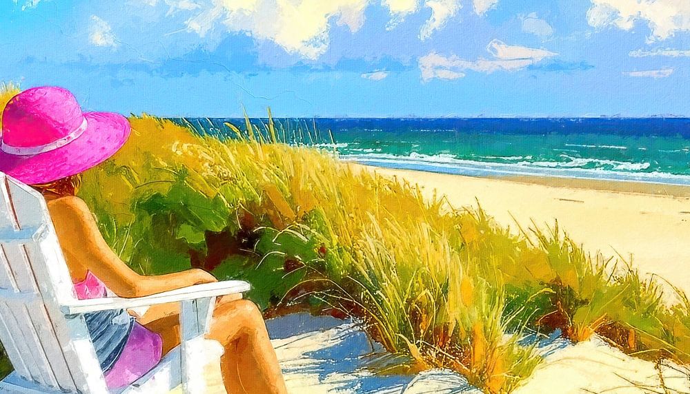 Bestelle diese Malerei Frau am Strand und Meer im Strandkorb von AidasignArt als Reproduktion auf Leinwand, Alu-Dibond, als Poster, Fototapete oder Acrylglasbild.