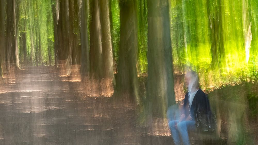 Eine Frau auf einer Bank im Wald sitzend, die Sonne scheint durch die Bäume, der Herbst bekommt einen zaghaften Anfang. Ein schöner Ruhepunkt eines schönen Spaziergangs.
