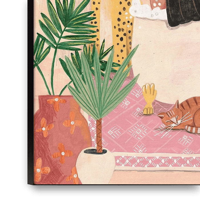Eine stimmungsvolle Bohème-Illustration einer Frau, die in der Badewanne liest. Mit einem schönen Panther, tropischen Pflanzen und einer Katze an ihrer Seite. Mit Blick auf einen wunderschönen Sonnenuntergang!