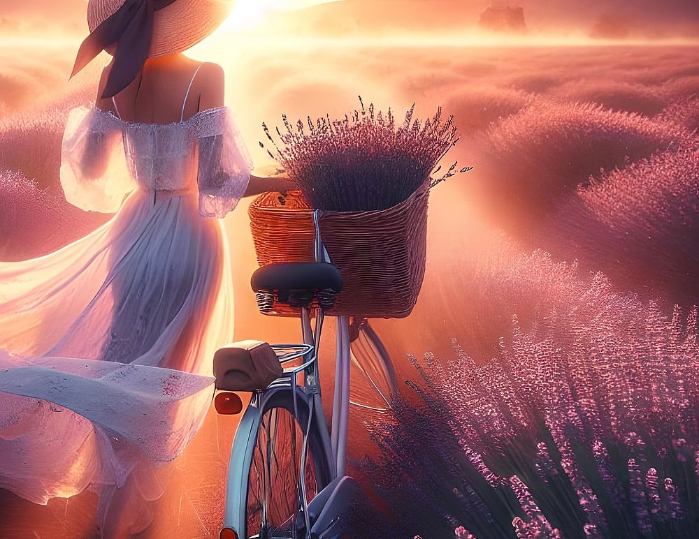 Frau genießt den Sonnenaufgang in einem Feld mit Lavendelblüten