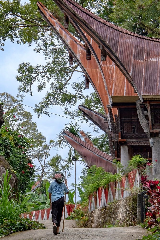Eine Frau geht an traditionellen Holzhäusern des Stammes der Toraja in Sulawesi, Indonesien, vorbei.