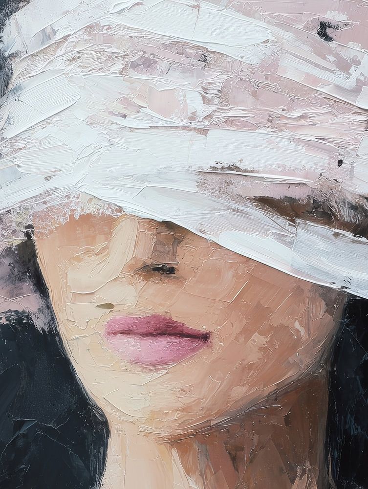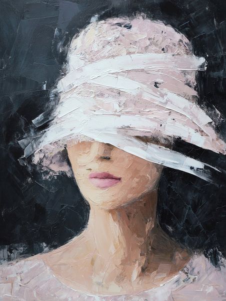 Dieses Porträt einer Frau mit Cloche-Hut strahlt einen starken Fine-Art-Look aus. Der Hintergrund ist tief und dunkel, fast nachtblau mit schwarzen und grauen Tönen, so dass die ganze Aufmerksamkeit auf ihr Gesicht und ihre Pose gerichtet ist. Die Farbgebung ist weich und sinnlich, mit pudrigen Pastellfarben wie Altrosa, Cremeweiß und…